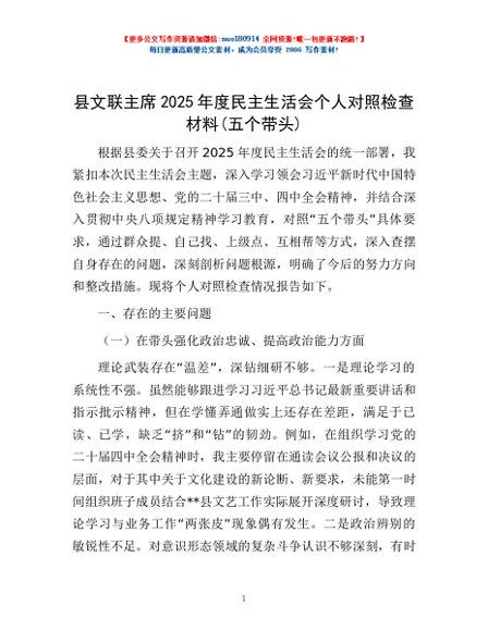 / 县文联主席2025年度民主生活会个人对照检查材料(五个带头)