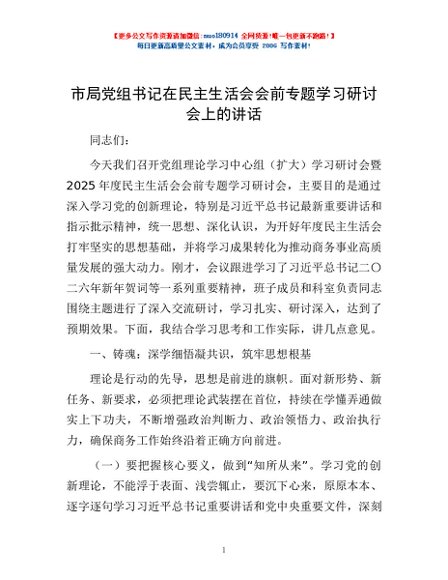 / 市局党组书记在民主生活会会前专题学习研讨会上的讲话