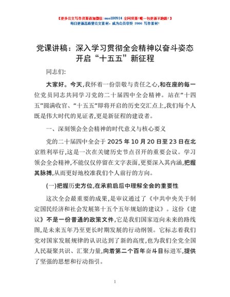 / 党课讲稿:深入学习贯彻全会精神 以奋斗姿态开启“十五五”新征程