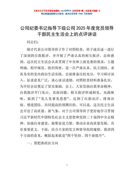 / 公司纪委书记指导下级公司2025年度党员领导干部民主生活会上的点评讲话