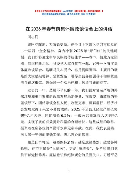 / 在2026年春节前集体廉政谈话会上的讲话