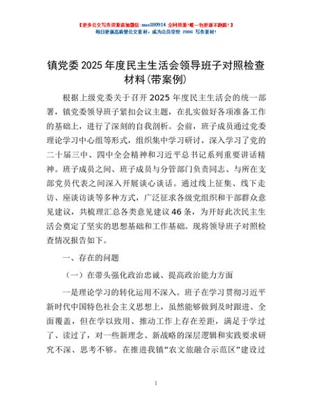 / 镇党委2025年度民主生活会领导班子对照检查材料(带案例)