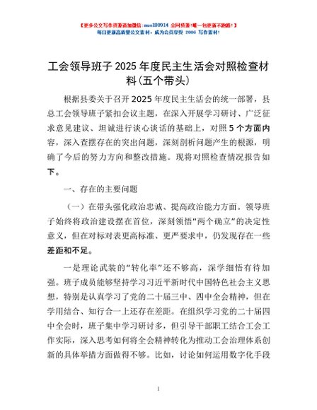 / 工会领导班子2025年度民主生活会对照检查材料(五个带头)