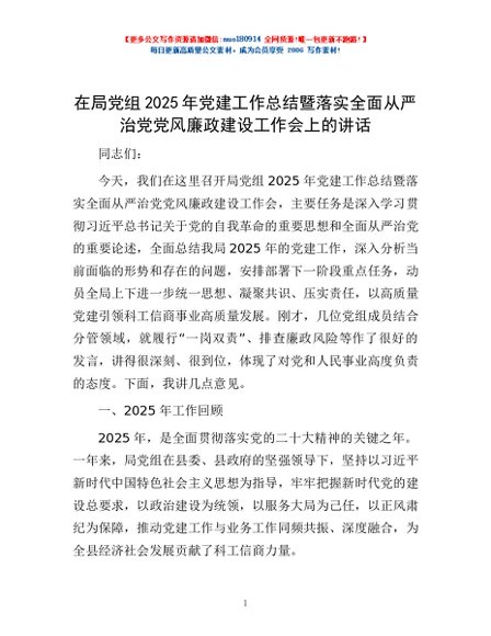 / 在局党组2025年党建工作总结暨落实全面从严治党党风廉政建设工作会上的讲话