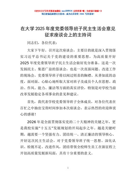 / 在大学2025年度党委领导班子民主生活会意见征求座谈会上的主持词