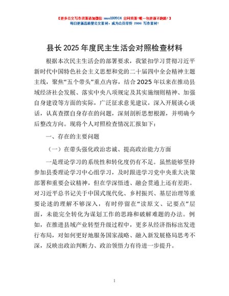 / 县长2025年度民主生活会对照检查材料