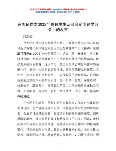 / 在国企党委2025年度民主生活会会前专题学习会上的发言