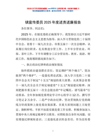/ 镇宣传委员2025年度述责述廉报告