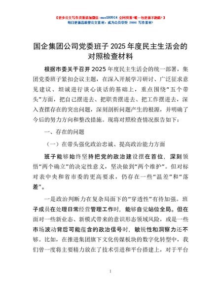/ 国企集团公司党委班子2025年度民主生活会的对照检查材料