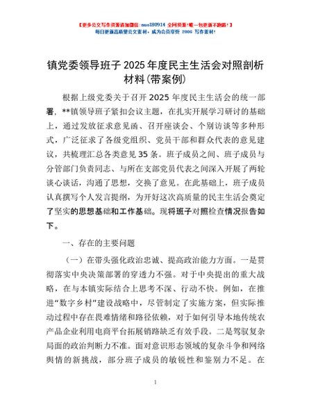 / 镇党委领导班子2025年度民主生活会对照剖析材料(带案例)