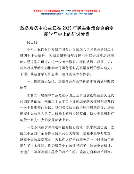 / 政务服务中心主任在2025年民主生活会会前专题学习会上的研讨发言