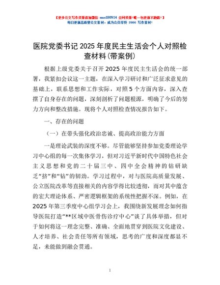 / 医院党委书记2025年度民主生活会个人对照检查材料(带案例)
