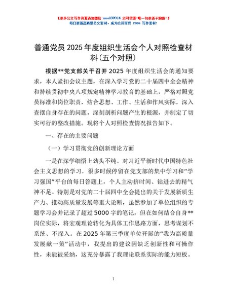 / 普通党员2025年度组织生活会个人对照检查材料(五个对照)