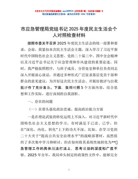 / 市应急管理局党组书记2025年度民主生活会个人对照检查材料