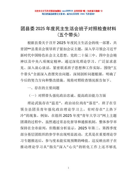 / 团县委2025年度民主生活会班子对照检查材料(五个带头)