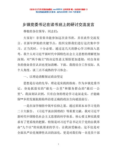 / 乡镇党委书记在读书班上的研讨交流发言