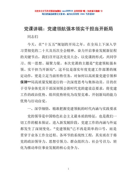 / 党课讲稿:党建领航强本领 实干担当开新局