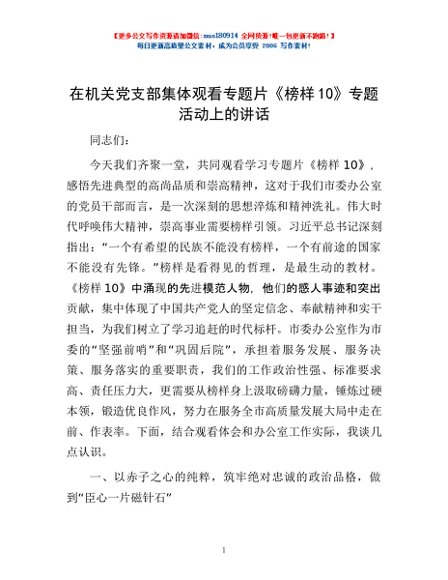 / 在机关党支部集体观看专题片《榜样10》专题活动上的讲话