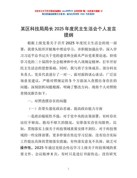 / 某区科技局局长2025年度民主生活会个人发言提纲