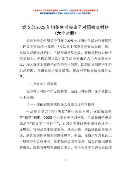 / 党支部2025年组织生活会班子对照检查材料(六个对照)