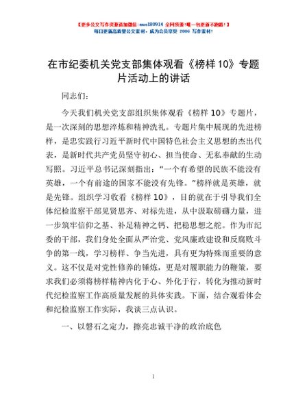 / 在市纪委机关党支部集体观看《榜样10》专题片活动上的讲话