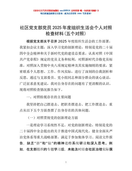 / 社区党支部党员2025年度组织生活会个人对照检查材料(五个对照)