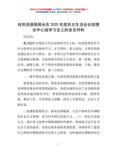 自然资源局局长在2025年度民主生活会会前理论中心组学习会上的发言材料 - 熬叔资料库