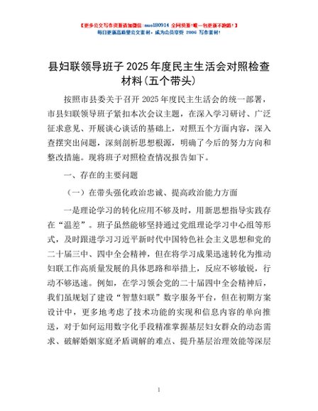 / 县妇联领导班子2025年度民主生活会对照检查材料(五个带头)