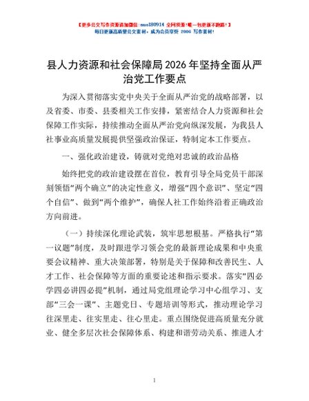 / 县人力资源和社会保障局2026年坚持全面从严治党工作要点