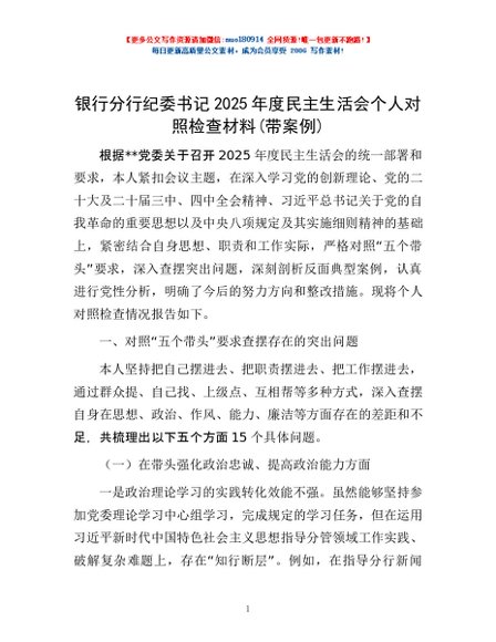 / 银行分行纪委书记2025年度民主生活会个人对照检查材料(带案例)