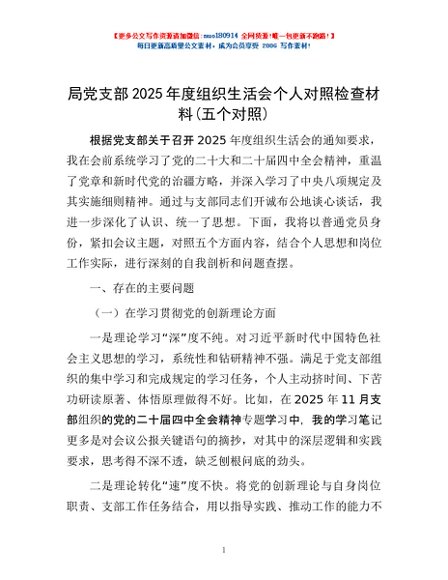 / 局党支部2025年度组织生活会个人对照检查材料(五个对照)