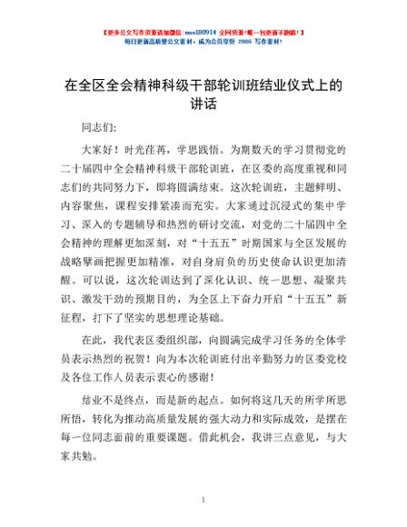 / 在全区全会精神科级干部轮训班结业仪式上的讲话