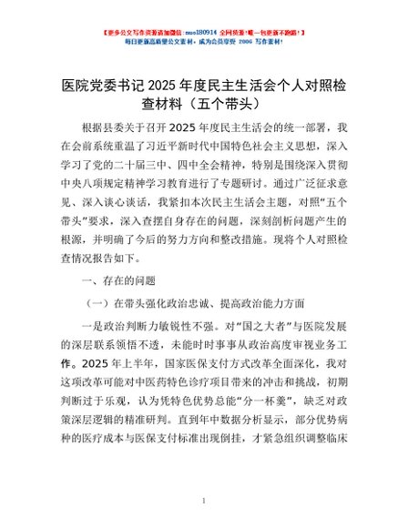 / 用户投稿专题-医院党委书记2025年度民主生活会个人对照检查材料(五个带头)
