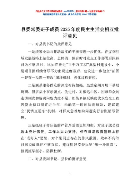 / 县委常委班子成员2025年度民主生活会相互批评意见