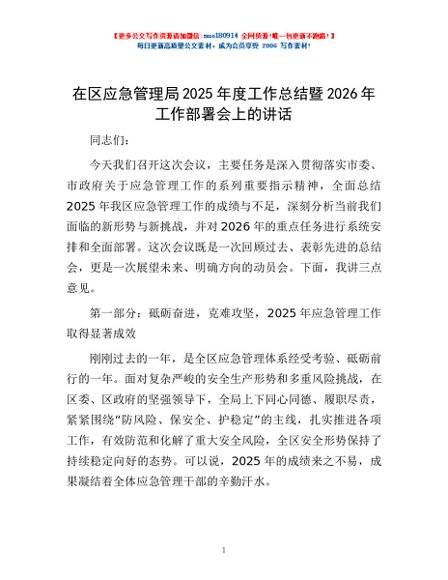 / 在区应急管理局2025年度工作总结暨2026年工作部署会上的讲话