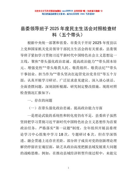 / 免费-县委领导班子2025年度民主生活会对照检查材料(五个带头)