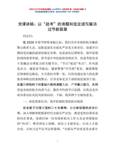 / 党课讲稿:以“赶考”的清醒和坚定谱写廉洁过节新篇章