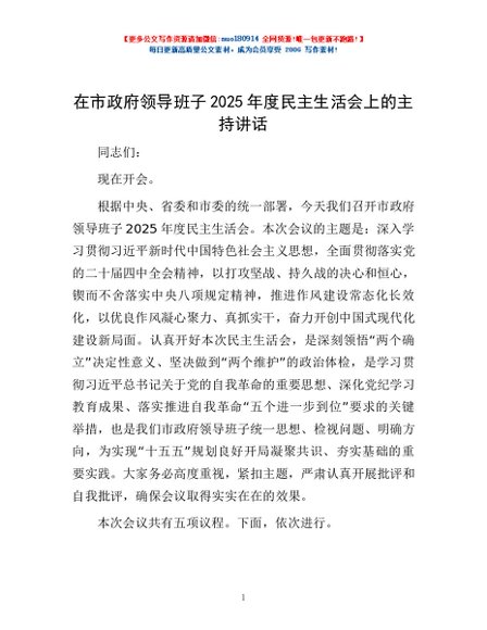 / 在市政府领导班子2025年度民主生活会上的主持讲话