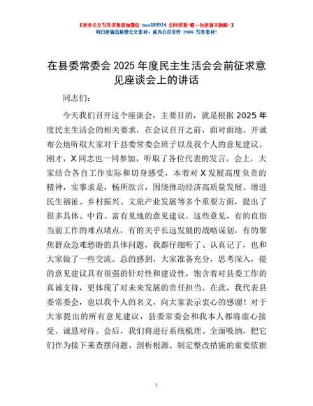 / 在县委常委会2025年度民主生活会会前征求意见座谈会上的讲话