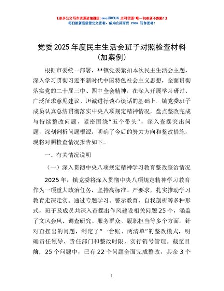 / 党委2025年度民主生活会班子对照检查材料(加案例)