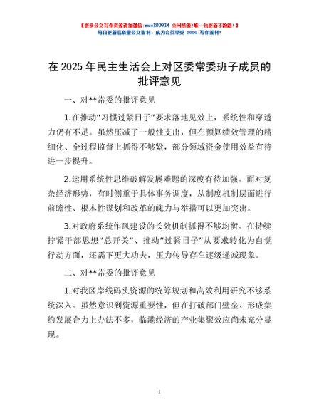/ 在2025年民主生活会上对区委常委班子成员的批评意见