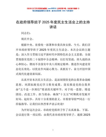 / 在政府领导班子2025年度民主生活会上的主持讲话