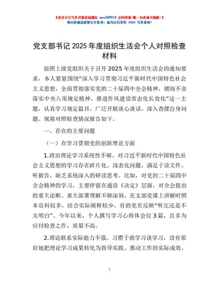 / 党支部书记2025年度组织生活会个人对照检查材料