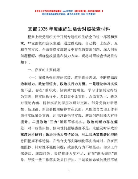 / 支部2025年度组织生活会对照检查材料