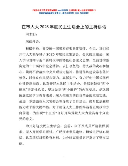 / 在市人大2025年度民主生活会上的主持讲话