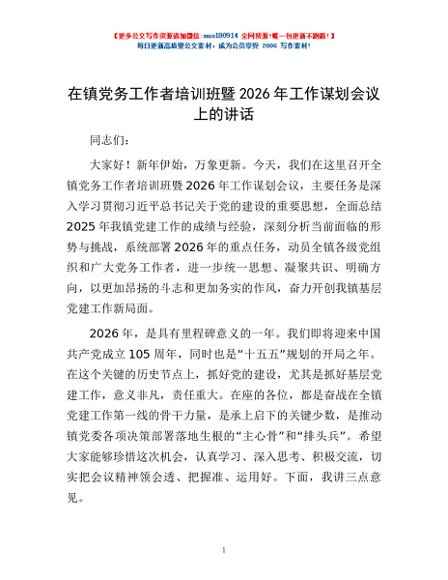 / 在镇党务工作者培训班暨2026年工作谋划会议上的讲话