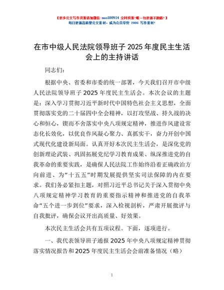 / 在市中级人民法院领导班子2025年度民主生活会上的主持讲话