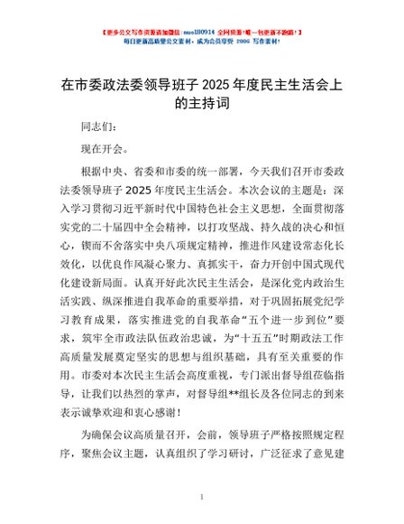 / 在市委政法委领导班子2025年度民主生活会上的主持词