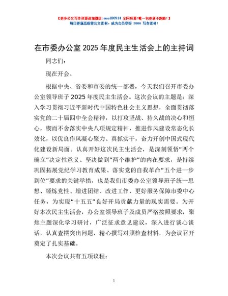 在市委政研室领导班子2025年度民主生活会上的主持词