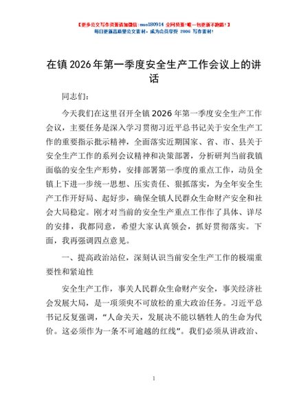 / 在镇2026年第一季度安全生产工作会议上的讲话